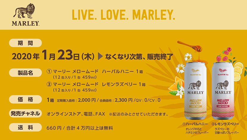 「Marley/マーリー」のラインアップの中から2種類の清涼飲料水が数量限定されます!